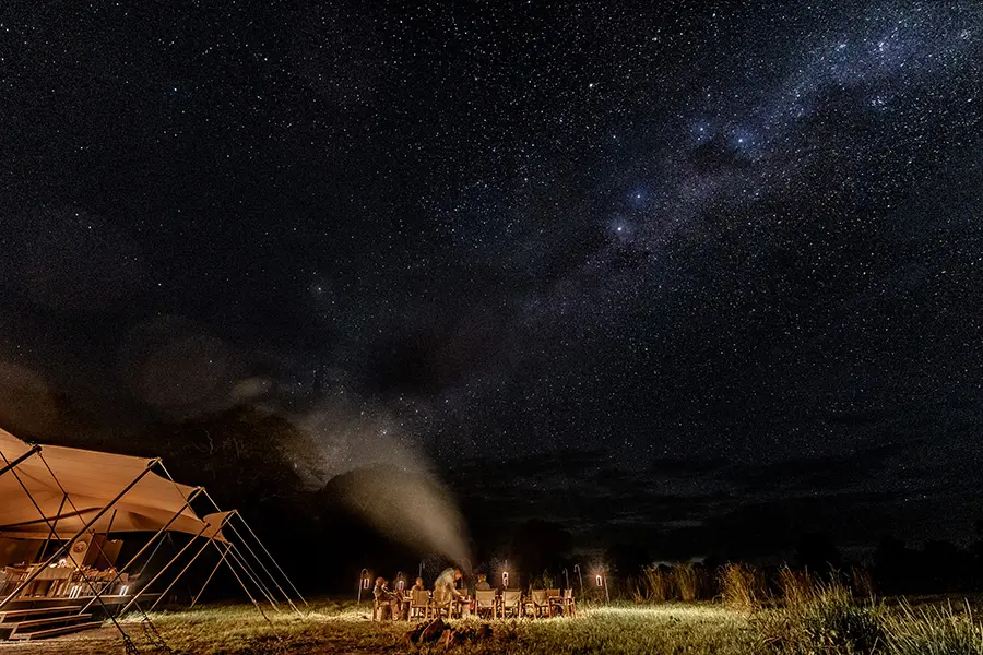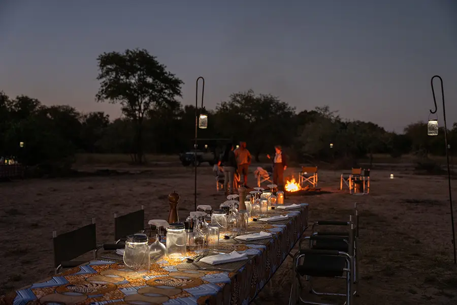 Chicari Camp serves up a variety of delicious meals beneath wooden-beamed canvas ceilings that blend into the landscape. Relish breathtaking views of the sun rising over the pans, creating a watery shimmer as you tuck into your breakfast. Lunchtime brings splendid views of wildlife visiting the pans to cool off during the heat of the day. Evenings usher in sundowners around the firepit, followed by safari-style dining paired with flavourful wines.