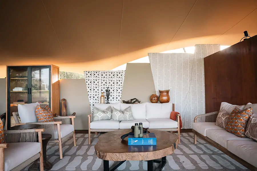 Designed to reflect the tranquillity of your surroundings, the tents feature a soft, soothing colour palette. African-inspired artworks and stylish chandeliers elevate the space, while candles on the side tables add a romantic glow.