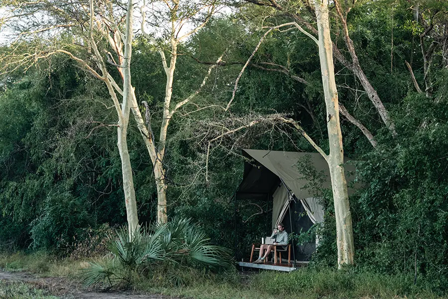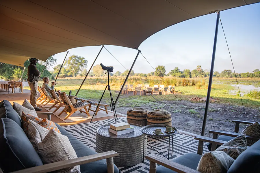 The camp is nestled along the edge of a forest and positioned in front of a seasonally inundated pan, which attracts a variety of wildlife that frequently gather to drink and splash in the waters. Whether on the main deck or your private verandah, the wilderness is at your doorstep. As a rustic tented safari, Chicari Camp blends minimalist lodgings with secluded safaris to highlight the natural environment.