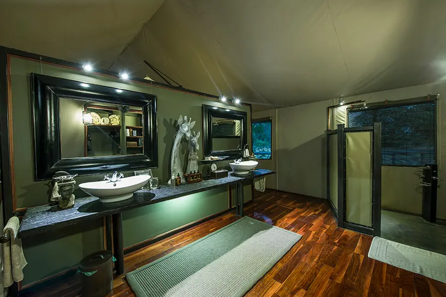 Each of Chitabe Camp’s eight suites is spacious, tastefully furnished and inviting. Hardwood floors extend to a private verandah with lovely floodplain views that tempt you to relax on a comfortable chair with a book, gently serenaded by birdcalls in the shady trees above. Glass windows keep the Meru-style tents cosy on cool winter nights, while fans and shade netting allow breezes through on warm afternoons. The large beds are elegantly draped with walk-in mosquito nets. Separate en suite bathrooms feature double basins, flush toilets and indoor and outdoor showers.