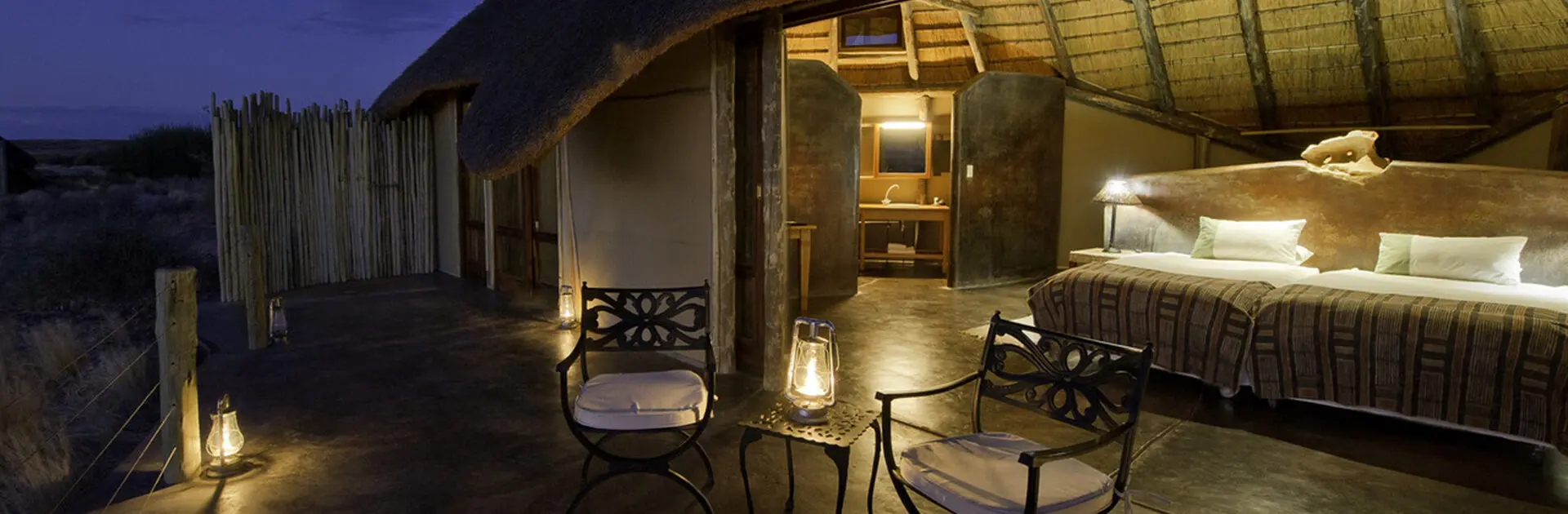 Accommodation at Doro Nawas Camp comprises 16 chalets which combine natural stone and canvas walls with wood and glass doors, all shaded by a thatch roof. The chalet's design and du00e9cor blend into the surrounding scenery and each one delivers comfort and luxury in the sometimes abrasive and arid semi-desert conditions.rnrnEach chalet has a large comfortable bed that can be wheeled out onto your verandah for an incredible night's sleep under the stars. Rooms are en suite with a shower, ‘his and hers' basins and a flush toilet; there is also an outdoor shower on your private veranda.