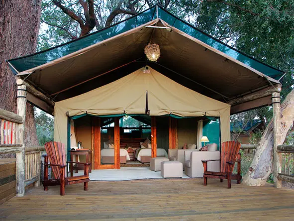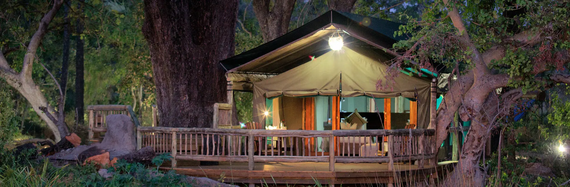 Deep in the Okavango Delta, overlooking Chief’s Island and bordering the Moremi Game Reserve, lies the exquisite Gunn’s Camp. This vintage safari camp is situated beneath leafy palms and African ebony trees, and provides luxurious comfort in Botswana’s beautiful wilderness, while remaining eco-friendly.