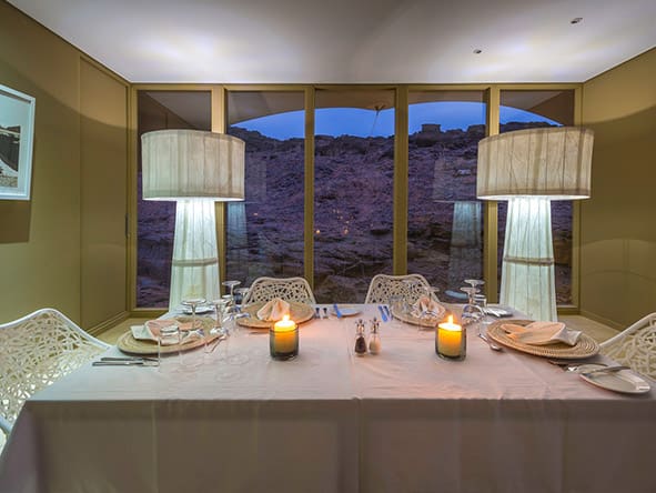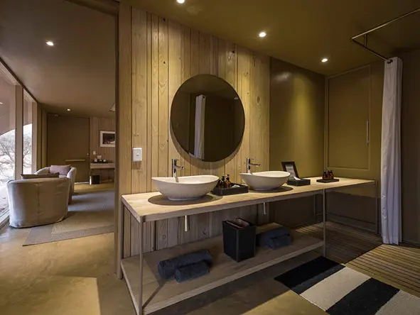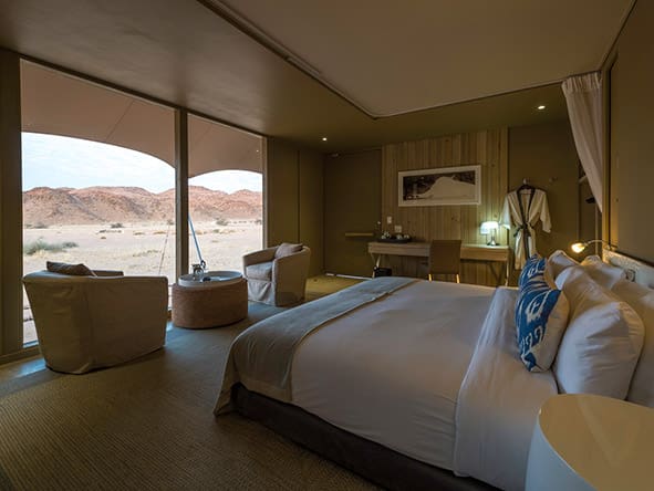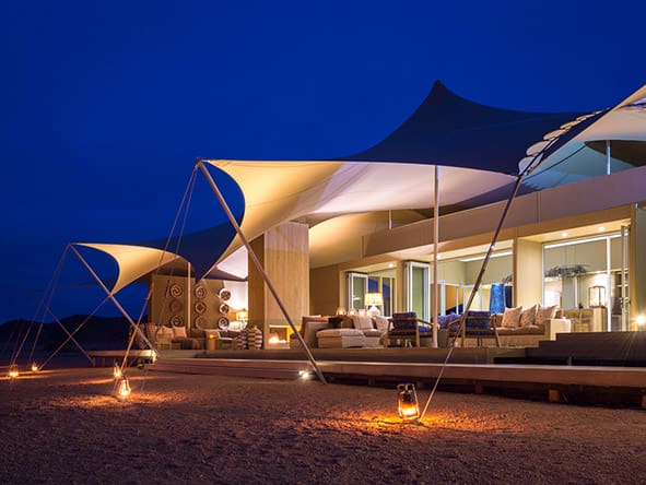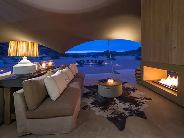 Weather permitting, evening meals are served in the open-air dining room under an old leadwood tree from where incredible desert views can be enjoyed. Menus make use of both locally-sourced and imported ingredients.