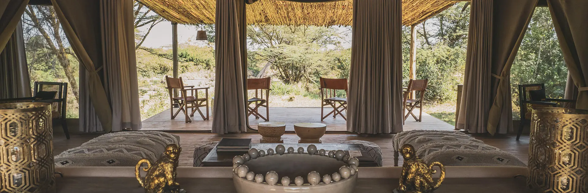 The main area of Ilkeliani Camp is a welcoming space with a central dining area, a lounge, and a bar that overlooks the Talek River. You can relax here after a day of safari, enjoying a sundowner while watching wildlife gather by the riverbanks.