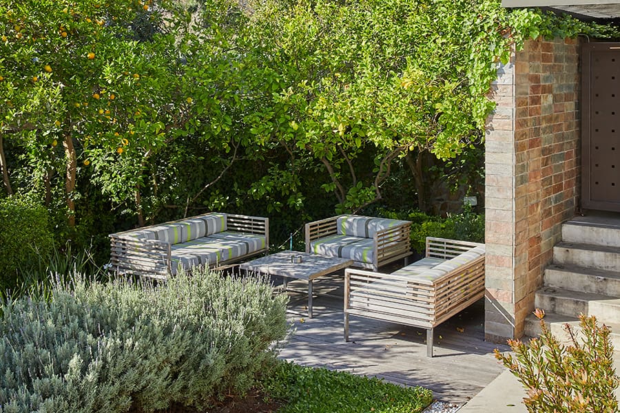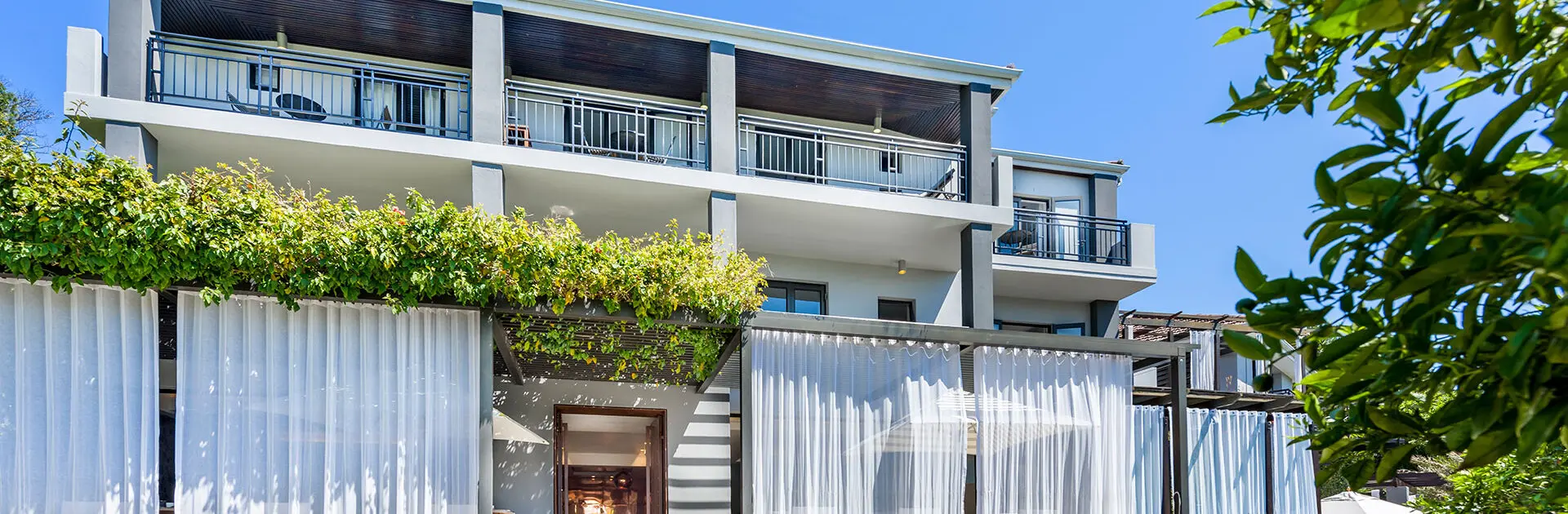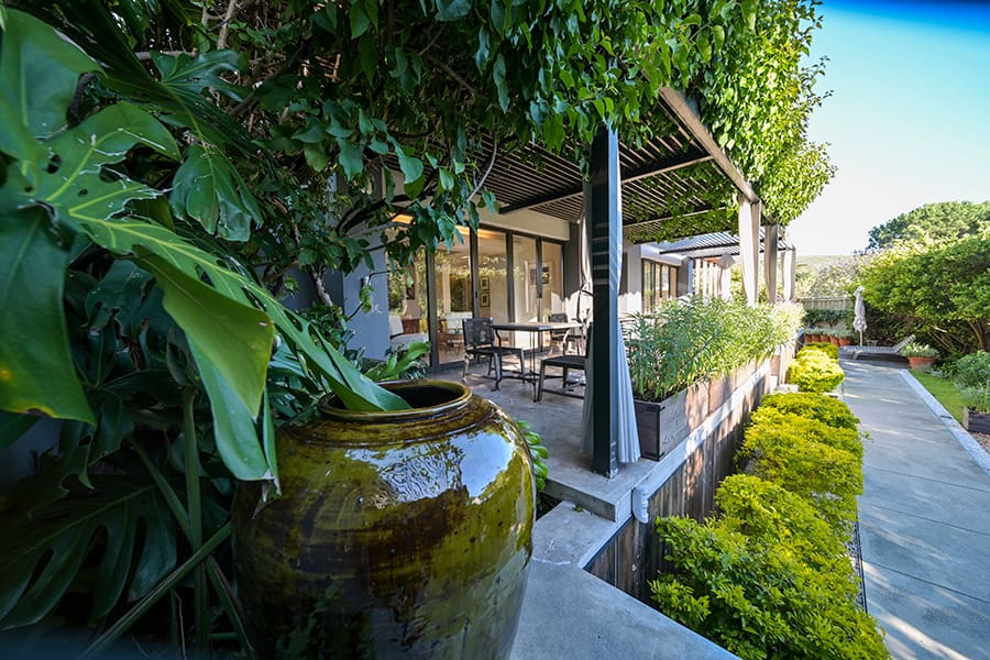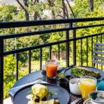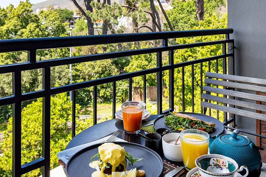 The spacious and inviting rooms feature a lounge area and a balcony overlooking the garden with sweeping views of Table mountain, city and ocean beyond. Or a ground floor terrace with outdoor seating in the garden setting.