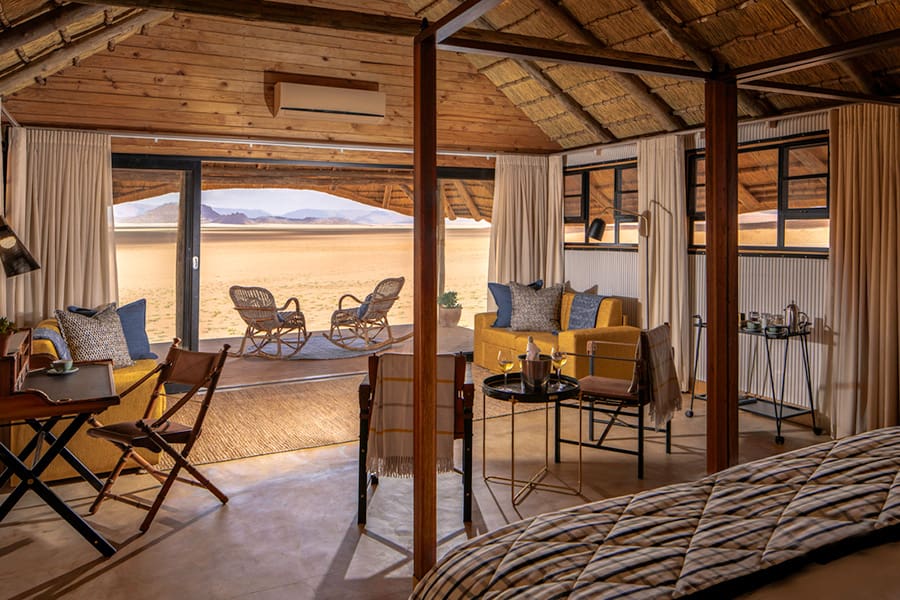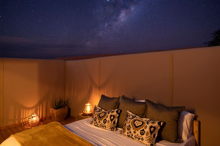 The highlight is the separate ‘stargazer’ room at the back of each chalet. Enjoy a night of staring as you’re lulled into a peaceful night’s sleep on your four-poster bed. Being the only Dark Sky Reserve in Africa, NamibRand is one of the least light-polluted areas in the world, affording the most spectacular view of the star-filled night sky.
