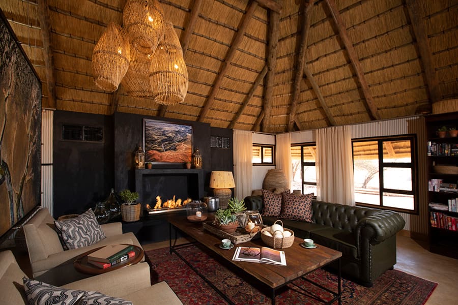 Constructed on a raised wooden deck and topped with a high thatched roof, Kwessi Dune's main building comprises traditional African elements to emphasise the feel of an authentic safari. Floor-to-ceiling glass doors provide an uninterrupted view of the striking NamibRand landscape, folding back to invite nature in. The cool and comfortable area is a great place to mingle with other guests and to unwind from a day of game drives. Escape the desert heat with a soak in the swimming pool which overlooks a popular waterhole visited regularly by oryx and zebra. Once the sun starts to set and the evening chill begins to creep up, grab drink from the well-stocked bar before curling up on the plush sofa and enjoying a good book from the small library. Better yet, head outside to the fire pit and swap stories over the warm glow of the flames.