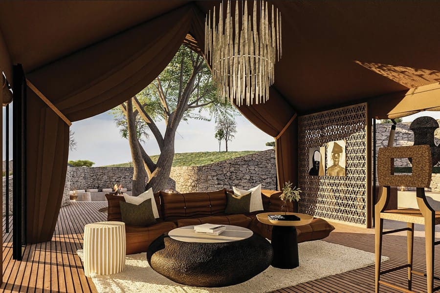A private viewing deck, complete with carpet, campaign chairs, and amenity station, creates an intimate spot to refresh between meals and safaris. The en-suite bathroom features a luxury bathtub and outdoor shower, inviting you to soak in your environment with Organic Healing Earth bath amenities that invigorate your senses.