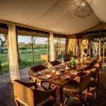 The communal area located in the mess tent includes a central bar for refreshment and plush leather sofas for relaxation after an exciting day of game viewing. Drinks can, and indeed should, be enjoyed out by the campfire as you watch the sunset and swop stories with your fellow guests.