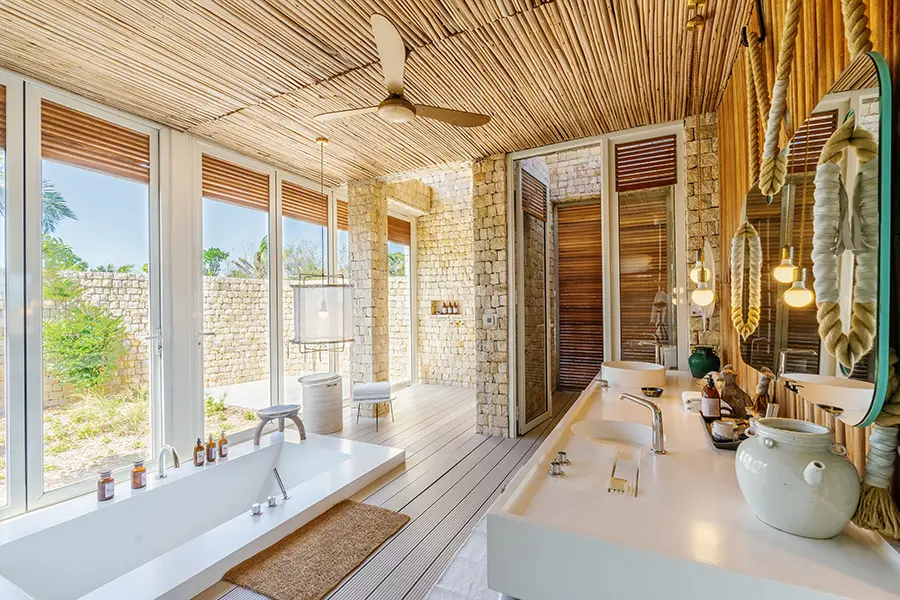 Gorgeous villas are dotted along the pristine beach, featuring floor-to-ceiling windows and sliding doors that offer panoramic views of the Indian Ocean, which is only a few steps away. Expect sensational attention to detail in these 450-square metre (4 840-square feet) villas, available in 1-, 2- or 3-bedroom configurations. Each boasts a private pool with fantastic sea views, a spacious lounge area and well-stocked kitchenette. Enjoy a private butler service, and complimentary bicycles and electric buggy with which to explore the island.
