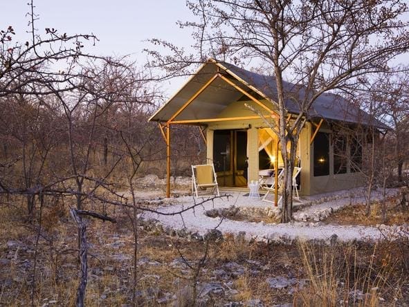 Sleep under canvas at this authentic tented camp, located near Namibia’s heavyweight Etosha National Park. Mushara Bush Camp's en suite tents are arranged around an airy, open-sided main building and the large swimming pool.