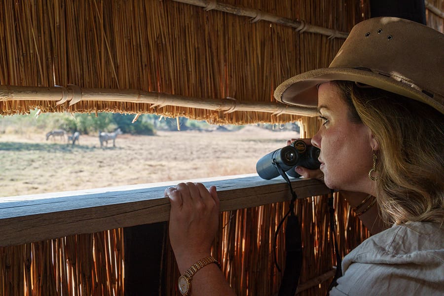 Set beside a huge termite mound, the shaded lounge and bar area at Nsefu Camp commands a spectacular view of the Luangwa River where the elephants cross on a daily basis. A small, informative library is also provided. For keen photographers and birders, the camp has a game viewing hide where you can sit quietly and watch animals and birds come and go, offering excellent opportunities to capture memorable moments up close.