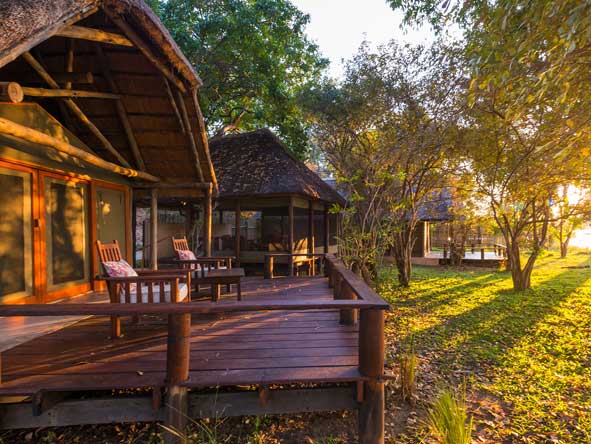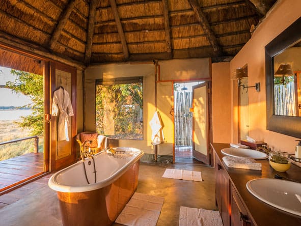 The thatched main building is light and airy, with polished floors and high ceilings to allow cooling breezes from the meandering Zambezi to pass through. A tastefully decorated lounge and dining area lead out to an expanse of wooden decking that hangs over the water with steps leading down to a jetty. The verandah leads to the bar below the spreading boughs of a mature and shady sausage tree, and beyond is a secluded pool deck with umbrellas and sun loungers overlooking the river.