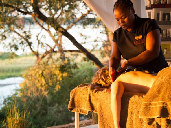 The Royal Zambezi Bush Spa is positioned around a central courtyard, where two treatment rooms offer a tranquil retreat to nourish your senses. The plunge pool, Jacuzzi and lounge alongside provide the perfect place to relax and drink in the splendid view.