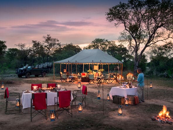 Your evening bush walk departs after afternoon tea and, naturally, the focus is on nocturnal wildlife such as bushbabies, genet and leopard. Make a toast to wildest Africa while enjoying a sundowner and embark on a brief 4×4 game drive before returning back to camp. Share epic tales of the day's sightings with other guests around the crackling campfire which precedes your flame-grilled dinner under the star-studded sky. Prick your ears to the calls of wildlife able to move freely through the camp, before retiring to your tent and starting the next chapter of your African dream.