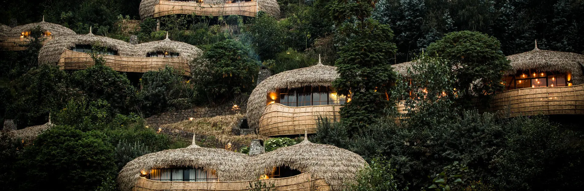 From the outside, Bisate's structures mimic traditional huts on the while interiors are sumptuous, offering comfort, warmth and luxury. In addition to six spacious suites, the lodge has a large living area with fireplaces and a cosy wine cellar. You will be able to enjoy walks through the 26-hectare reserve and learn about the reforestation project. The national park headquarters are located within easy driving distance, from where gorilla treks depart daily.