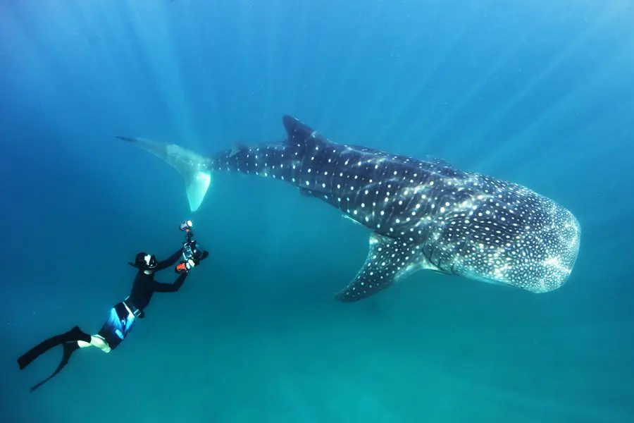 Longer than a London bus and weighing twice as much, the whale shark is the ocean's biggest fish by a country mile. But its great size belies a curious fact: slow-moving, filter-feeding whale sharks are about as dangerous as a dozing cow. Snorkellers have even grasped a table-sized fin to catch a ride! Young whale sharks are known to be playful with human divers.