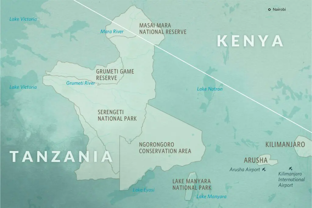 Tanzania's flagship park lies in the north-western corner of the country and borders with Kenya to the north. The conservation area continues across the Kenyan border into the Masai Mara National Reserve, together forming the Serengeti-Mara Ecosystem – one of the biggest and most protected ecosystems on Earth. It spans approximately 30,000 square kilometres (12,000 square miles) – about the size of South Carolina.