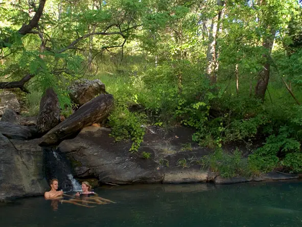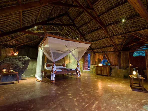 Los lujosos chalés rústicos cuentan con una romántica cama con dosel cubierta de mosquitera, iluminación eléctrica todas las noches y un cuarto de baño privado diseñado para que pueda bañarse al aire libre bajo la copa de los árboles con total intimidad. Todos los cuartos de baño tienen duchas colgadas de las ramas con agua corriente caliente y fría, y algunas de las bañeras están talladas en la roca natural.