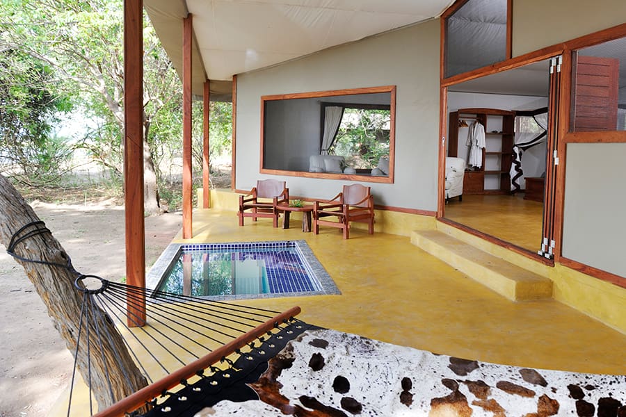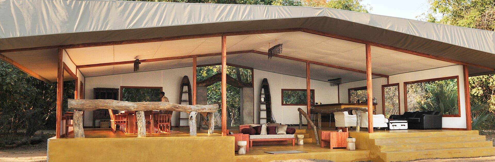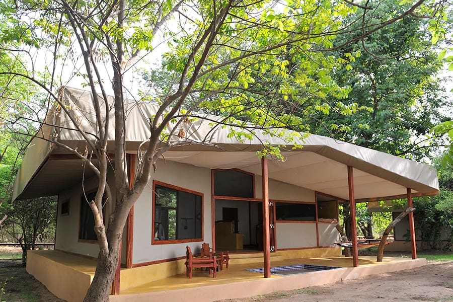 Este lodge de bello diseño se integra perfectamente en el entorno ribereño. Pasarelas elevadas de madera conectan las cuatro suites con el bar central, el comedor y el salón, que es una mezcla de madera y lona con una decoración encantadora y toques finales.