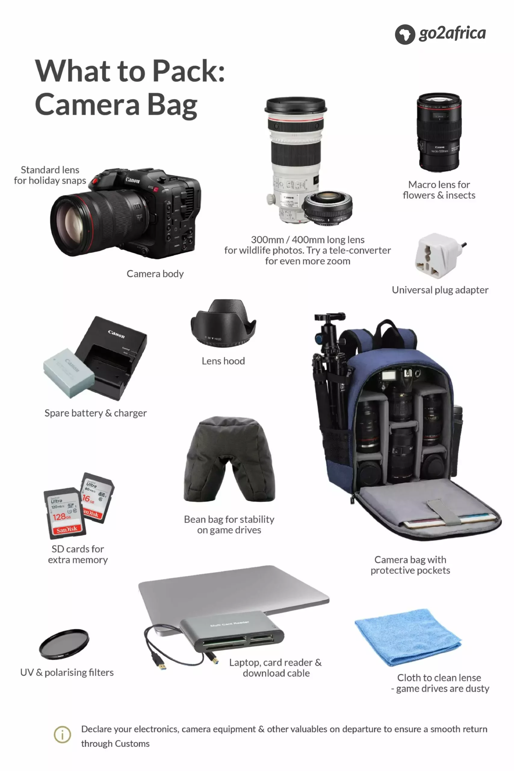 ¿Qué tipo de adaptadores de enchufe necesito para África? ¿Qué tipo de objetivos son los mejores para fotografiar animales salvajes? Ha llegado la hora de Safari fotográfico por África y ¡tienes preguntas! Esta práctica infografía te ayudará con la lista de comprobación de la bolsa de la cámara y, a continuación, encontrarás nuestros mejores consejos para preparar un safari fotográfico, incluida una lista del equipo fotográfico recomendado.