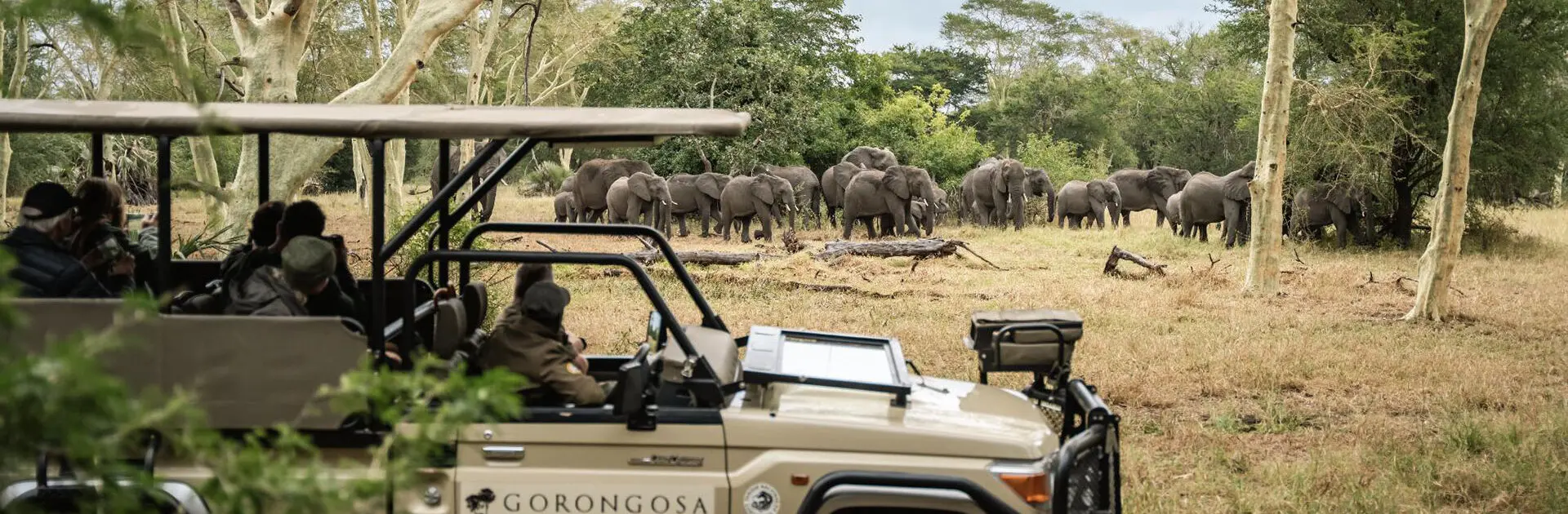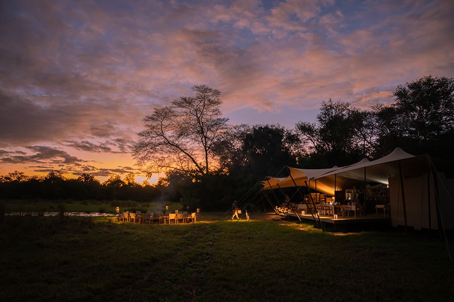 À chegada ao Aeroporto Internacional da Beira, um voo charter leva-o até à pista de aterragem de Chitengo para as suas primeiras duas noites numa suite de tenda boutique no Muzimu Lodge. Depois de se instalar, um passeio de caça ao fim da tarde oferece um vislumbre privado das paisagens icónicas do parque, sem outros veículos à vista. As vistas do pôr do sol são acompanhadas por refeições ligeiras e o tilintar de copos de vinho, antes de regressar ao acampamento para um jantar gourmet sob um manto de estrelas.