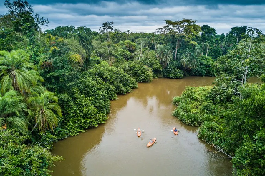 Your final morning at Ngaga can be spent relaxing at camp before a road transfer to Mboko Camp where you will stop for lunch. Leaving Mboko, you kayak along the Lekoli River to Lango Camp, a journey that takes you back into pristine equatorial rainforest – this time at the heart of the Odzala-Kokoua National Park. Your cottage is built into the gallery forest and overlooks a ‘bai’, a local word for an area of open marshy ground surrounded by forest. These bais are often laden with salts and minerals and are visited regularly by elephants and buffalos, as well as flocks of parrots and herds of antelope. The surrounding rainforest is good habitat for primates and several species may be seen here during your nature walks, night drives, 4×4 and boating excursions.