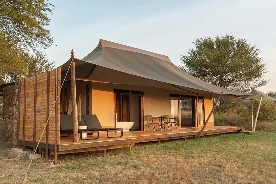 Settle into your spacious tent and take in the panoramic views of the Serengeti plains outside. Maybe squeeze in a quick swim in the lodge pool before a delicious high tea spread and afternoon game drive. Arrive back at camp to a warm welcome and a delicious lantern-lit dinner served in the intimate dining area or outside under the stars.